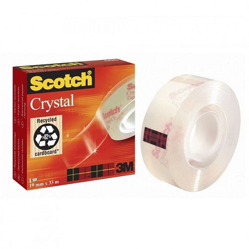 Scotch Nastro Crystal Clear in scatola singola. In acetato di cellulosa, supertrasparente, si taglia anche con le mani, dura nel tempo, non teme l'umidità e non ingiallisce. Srotolamento silenzioso.
