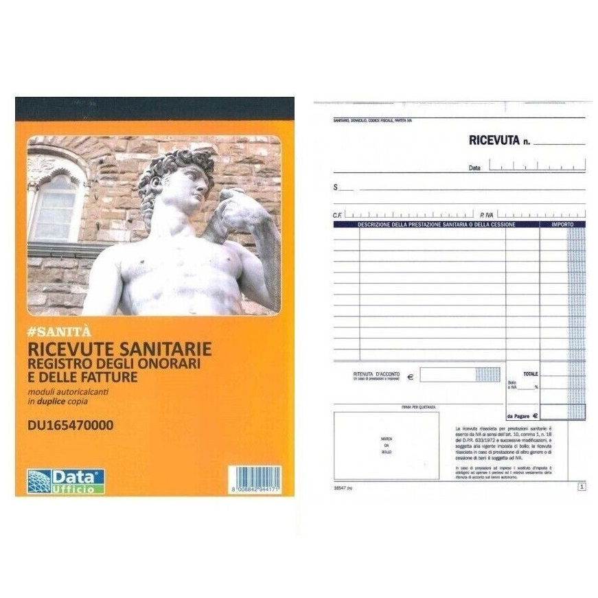 Blocco ricevuta sanitaria 50 x 2 autoricalcante. Formato 23 x 15 cm.